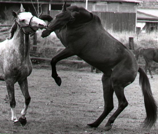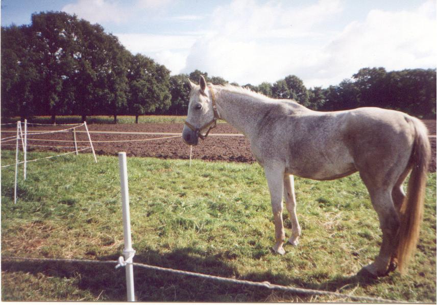 Hallo, mein Name ist Gino, ich bin ein 14jähriger Traber-Wallach, und mich gibt es nicht als Steckbrief, sondern nur als Als meine Chefin Gerlinde mich vor acht Jahren kaufte, wünschte sie sich eigentlich nur ein problemloses Freizeitpferd. Aber nicht mit mir! Beim ersten Galopp im Wald wickelten wir uns erstmal um den nächsten Baum, und auch in der Halle küßten wir den Boden. So viele Beine zu koordinieren ist nunmal nicht so einfach, und außerdem machte mir Steigen, Treten und Beißen sowieso viel mehr Spaß. Naja, als meine Besitzerin unerwartet zurückbiß, war die Rangordnung geklärt. Ein schlauer Mensch meinte aber, daß das mit Dressur oder Springen oder was auch immer sowieso nicht klappen wird und riet meiner Chefin, doch auf Distanzen zu gehen. Roman: |