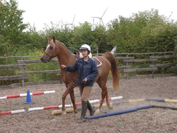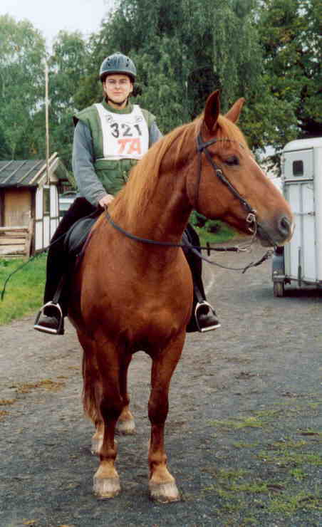 Hallo! Ich bin die Sarah und möchte mich und meine AV-Stute "Savannah" hier kurz vorstellen... Wir hatten 2001 unsere erste Saison mit 4 EFR. 2002 sind wir keine Ritte gegangen, da ich mir das Jahr als Babypause genommen habe -> Sohn Moritz ist im Juni zur Welt gekommen. 2003 wollen wir aber unbedingt wieder starten, wir können es kaum abwarten! Ich muss allerding sehr vorsichtig vorgehen, da Savannah 5-jährig nach einem Tritt ein Beinbruch erlitt. Savannah ist nun 9 Jahre alt und (bisher) voll belastbar. Ausserdem möchte ich 2003 oder spätestens 2004 als Erstveranstalterin aktiv werden... Es gibt viel zu tun - packen wir`s an! Sarah & Savannah |